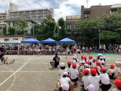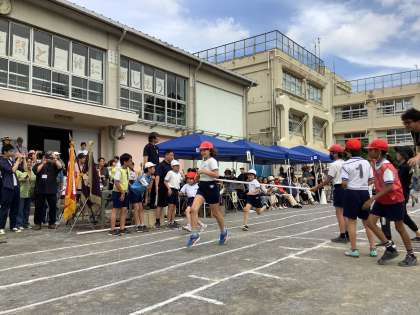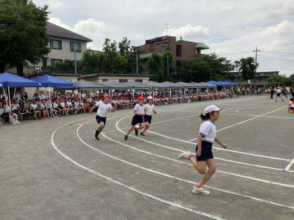 80mと距離が伸びた中学年。コーナーでは体を傾け、腕を思いっきりふり、ゴールを目指しましt。