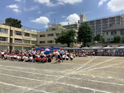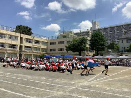 4人1組となって、心を込めてバランスボールを運びました。途中でジャンプ、回転と気持ちを一つに頑張りました。