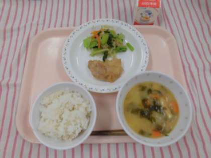 麦ごはん 鶏肉のごまみそがらめ おひたし みそ汁 牛乳
