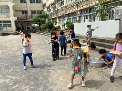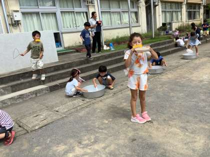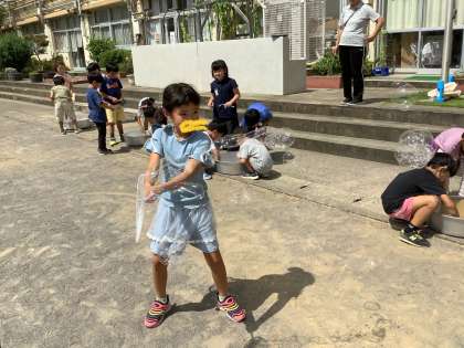 「なつとともだち」の単元で、シャボン玉を作りました。うちわや段ボール、ラップの芯など色々な道具で挑戦しました。道具を変えたり、強く吹いたり優しくそっと吹いたりして、色々な方法を試し、シャボン玉の作り方を発見することができました。