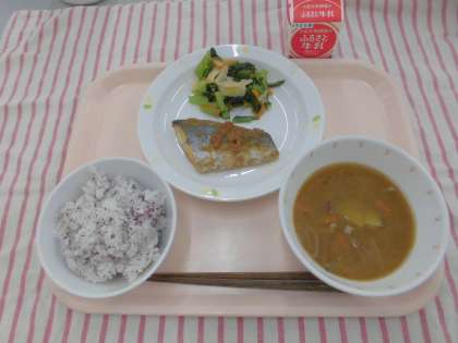 <重陽の節句> ゆかりごはん 魚のねぎみそ焼き 菊花あえ さつま汁 牛乳