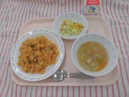 <世界の料理・アメリカ> ジャンバラヤ コールスローサラダ ジュリエンヌスープ 牛乳