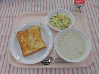 ツナエッグトースト マカロニサラダ クラムチャウダー 牛乳