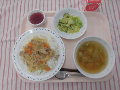 豚丼 キャベツの塩こんぶかけ けんちん汁 ぶどうゼリー 牛乳