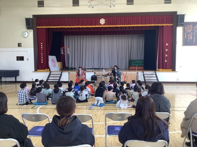 馬頭琴奏者の美炎さんとパーカッション奏者の前田さんをお迎えして、馬頭琴の演奏会を行いました。国語の学習「スーホの白い馬」ででてきた馬頭琴を目の前で演奏していただき、子どもたちは体育館に鳴り響く音に聴き入っていました。