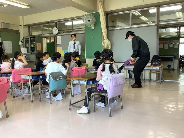 アルソックの方をお招きし、セーフティ教室を行いました。怪しい人はどんな感じかを皆で出し合い、実際にそのような場面ではどのようなことが必要なのか、「イカのおすし」を学びました。