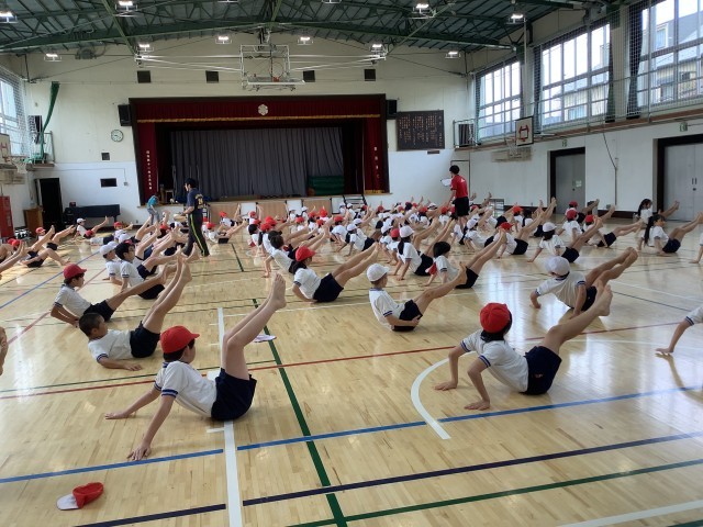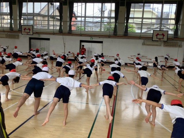 運動会の練習も本格的に始まりました。実行委員が前でお手本を示しながら、一つ一つの技にメリハリを付けて、指先まで伸ばし、ピタッと止まる。今日は一人技の練習でした。