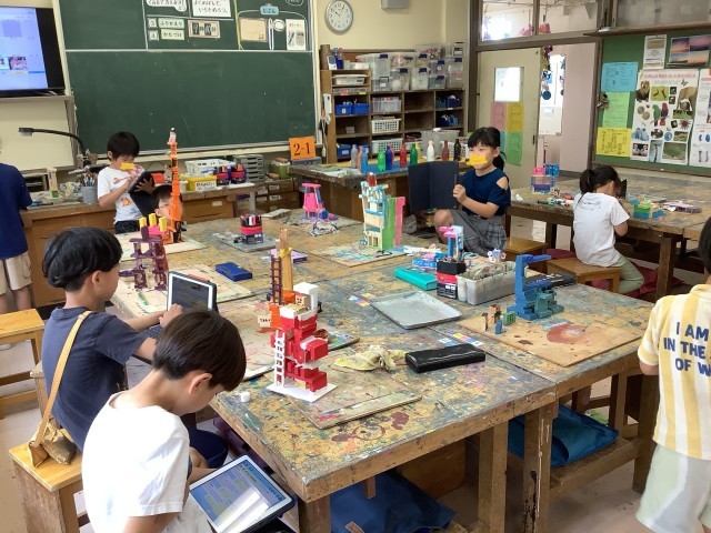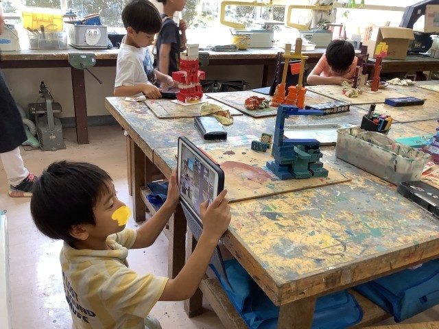 角材を組み合わせた塔にいる「ずこびとくん」は、運動会に向けて頑張るみんなを応援しています。出来上がった作品は撮影して、振り返りにも使います。