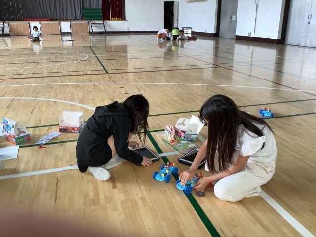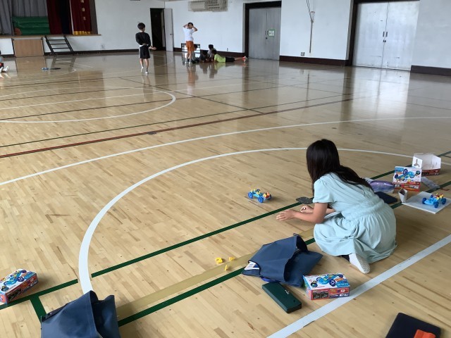 乾電池の数を変え、モーターカーを走らせて、データを集めています。「数が変わると全然違います」驚きの結果を教えてくれました。