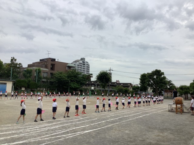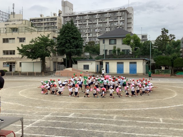 元気一杯の中学年の表現運動。今年は扇子を使って、優雅な舞を披露します。校庭での練習も回を重ねるにつれて、動きが揃って綺麗になってきました。「ヤーッ!」の決めの一言に気合いが入っています。