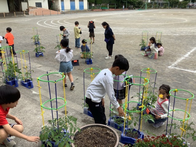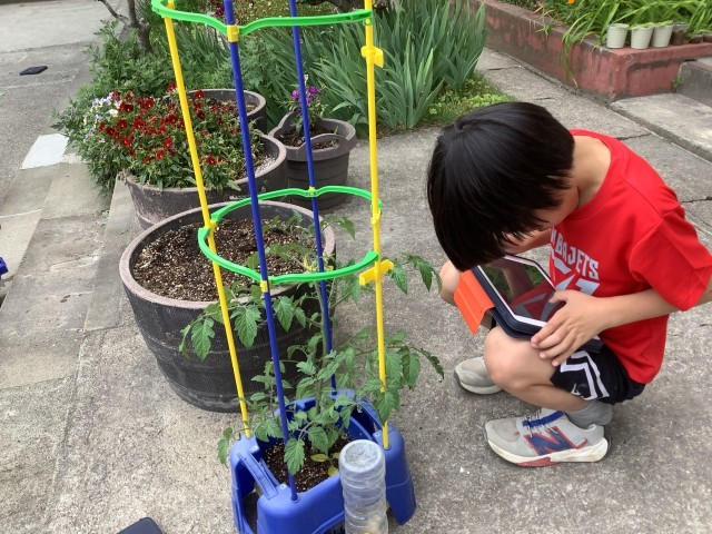 生活科で育てているトマトの観察をしました。毎日の水やりの成果で、お花も咲いています。見て、触って、匂いを嗅いで、気がついたこと、見つけたことを記録しました。