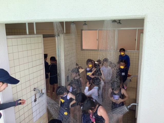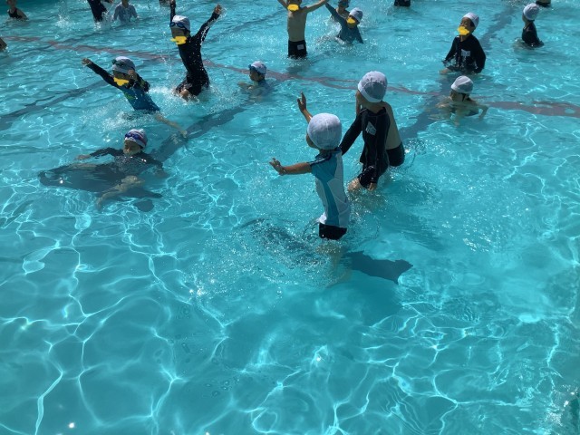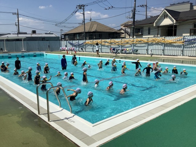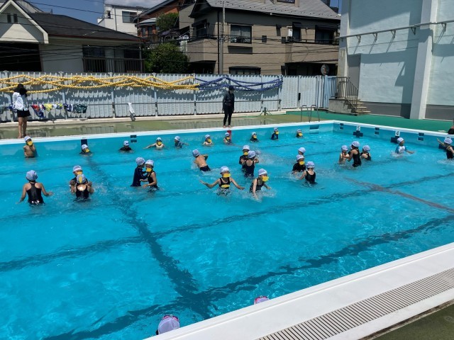 初めての小学校のプールに入った1年生。水の中を歩いたり、しゃがんで思いっきりジャンプをしたり、笑顔いっぱいの水遊びの時間でした。
