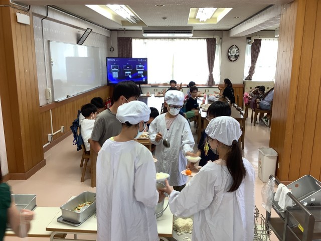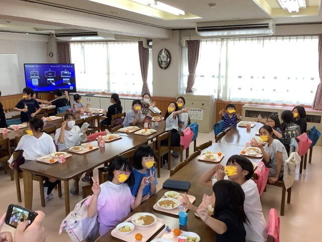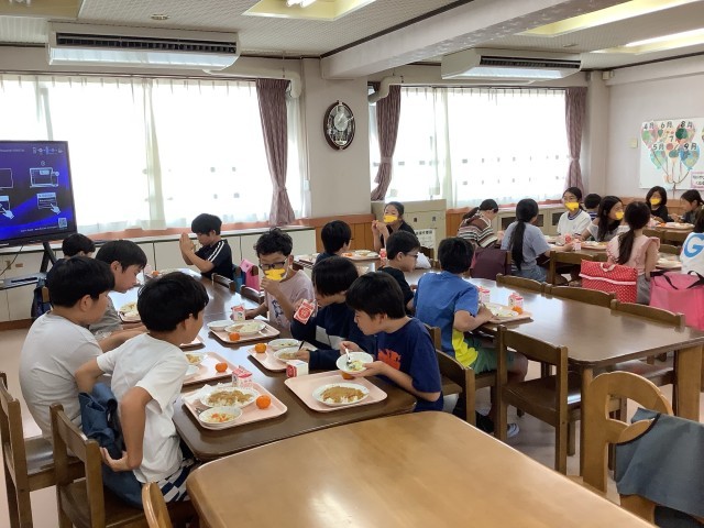 ランチルーム給食が始まっています。金曜日は5年2組でした。カレーライスを美味しそうに食べている楽しそうな姿が印象的でした。