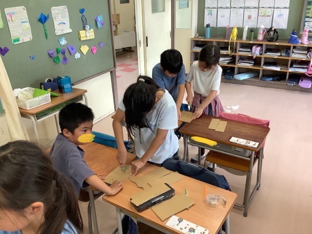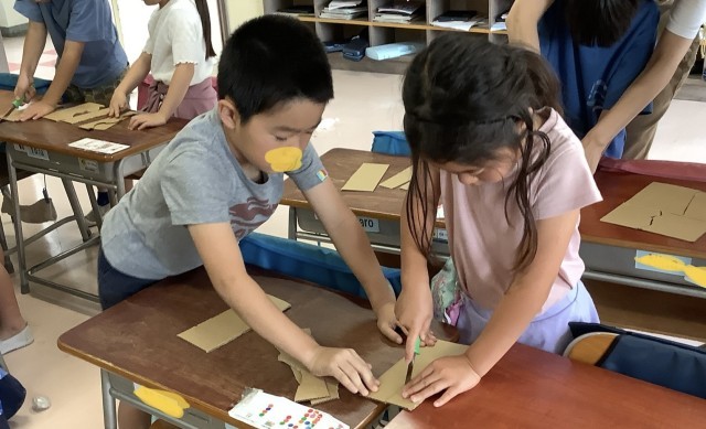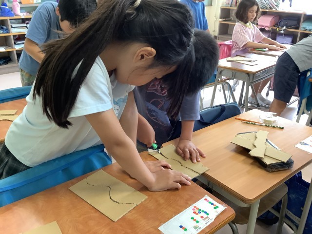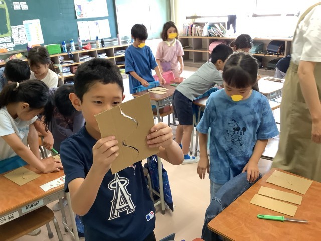 今日は、ダンボールカッターの使い方を練習しました。先生から持ち方や切り方を教わったのですが、気がついたら自分が持ちやすい持ち方や切り方に。先生に修正してもらいながら、友達と協力して活動しました。