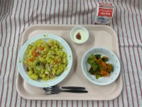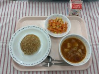 焼きカレーパン キャロットサラダボルシチ 牛乳