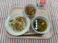 <1年2組 リクエスト献立>わかめごはん 鶏肉のからあげパリパリサラダ フルーツ...