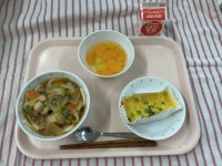 <1年1組 リクエスト献立>ちゃんこうどん 千草焼きフルーツポンチ 牛乳