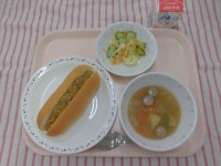 ドライカレーサンド フレンチサラダ白いんげんの田舎風スープ 牛乳