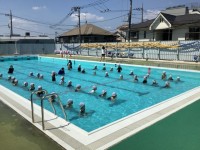初めての小学校のプールに入った1年生。水の中を歩いたり、しゃがんで思いっきりジャ...