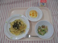 和風スパゲティ ビーンズサラダ桃とヨーグルトのケーキ 牛乳