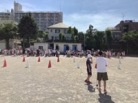 体育委員会主催の体育朝会は「縦割り班対抗リレー」を行いました。小型ハードルを走り...