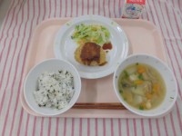 わかめごはん 和風スープコロッケ(カレー味)フレンチサラダ牛乳