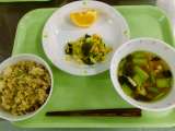 〇本日の献立〇磯おこわ 牛乳 菜脯蛋(ツァイプーダン 台湾風卵焼き) 野菜の辛み...