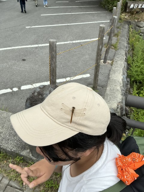 源泉からの帰り、たくさん飛んでいるトンボが帽子の上で一休み。