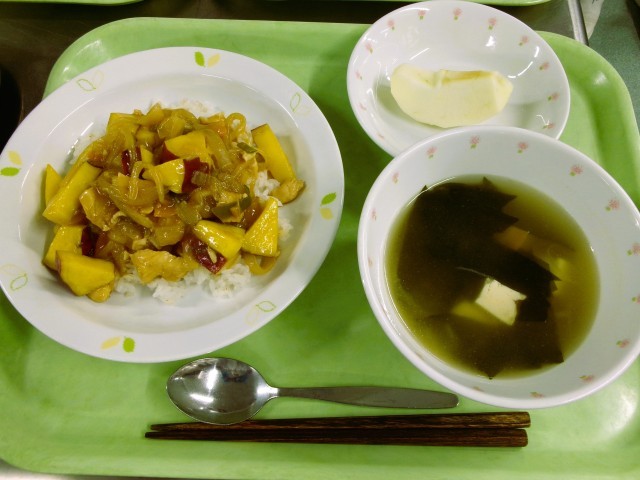 今日の献立、タッカルビは、韓国春川市の郷土料理です。鶏肉と野菜、さつまいもを甘辛いトウガラシみそ(コチュジャン)で炒めた焼き肉料理です。ミヨックは、朝鮮半島のわかめスープの呼び名です。りんごはどうよばれるのでしょうね。ぜひ調べてみてください。