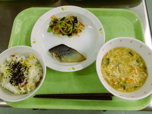 菊花ごはん 牛乳 魚のみそ麹焼き 野菜の磯あえ かきたま汁
