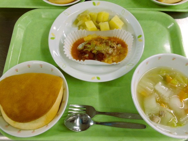 ショートニングパン 牛乳 魚のピザ風 ジャーマンポテト 白いんげん豆の田舎風スープ