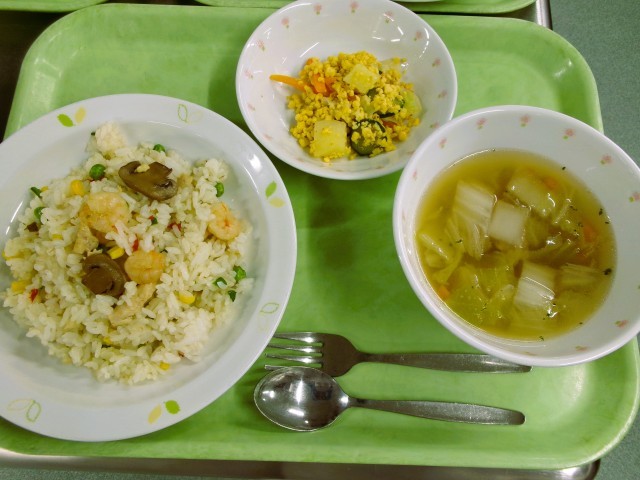 えびピラフ 牛乳 たまごサラダ 白菜のスープ