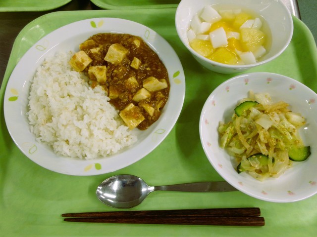 麦ごはん 牛乳 麻婆豆腐 中華サラダ 杏仁豆腐