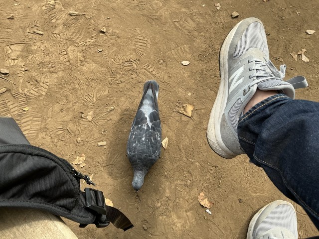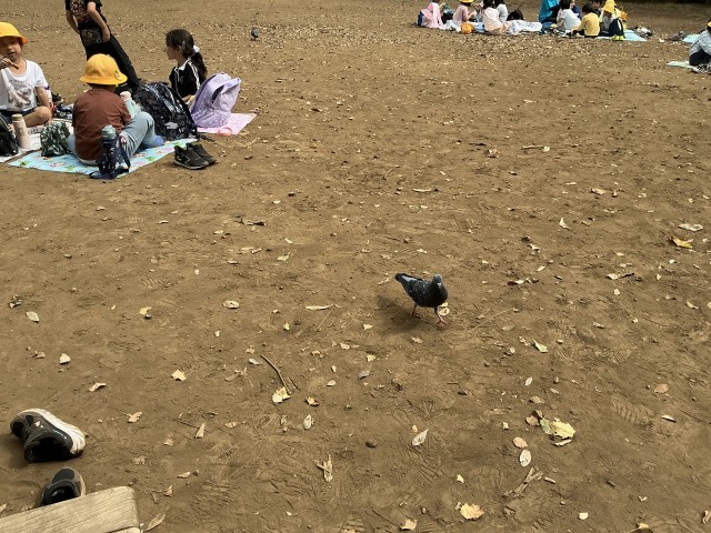 おいしいお弁当のおこぼれがないかと、鳩が足元まで…。