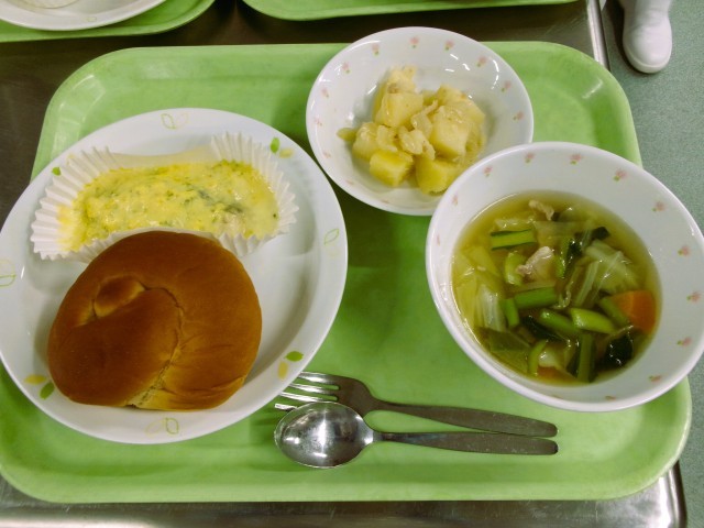 黒砂糖パン 牛乳 魚のマヨネーズ焼き ジャーマンポテト キャベツのスープ