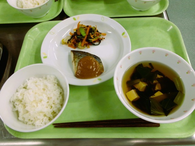 ごはん 牛乳 魚のみそだれかけ 白菜と小松菜ののりあえ すまし汁