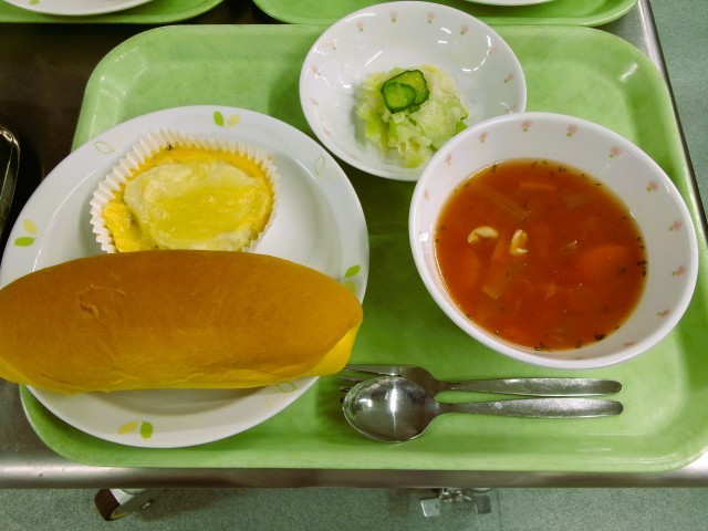 パンプキンパン 牛乳 フレンチエッグ グリーンサラダ トマトスープ
