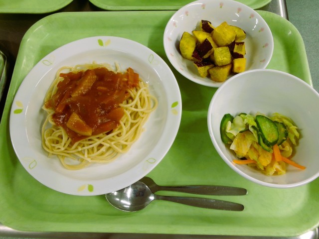 スパゲッティ地中海ソース 牛乳 にんじんドレッシングサラダ シナモンポテト