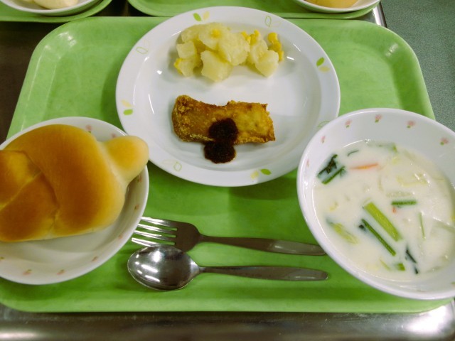 ミルクパン 牛乳 魚のバーベキューソース コーンポテト 白菜のミルクスープ