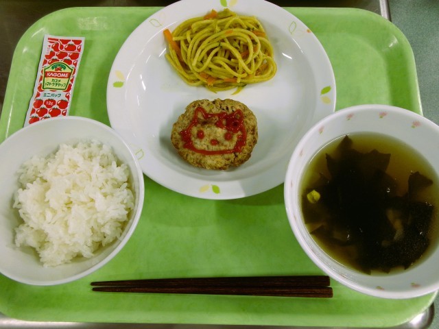 ごはん 牛乳 お絵描きハンバーグ スパゲッティカレーソテー わかめスープ