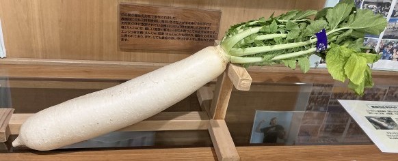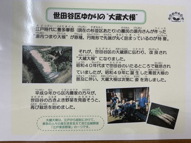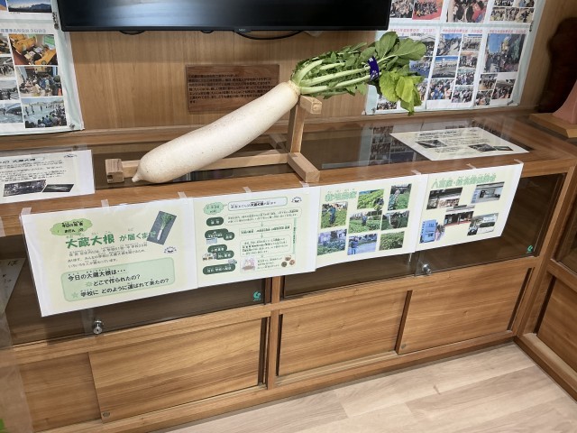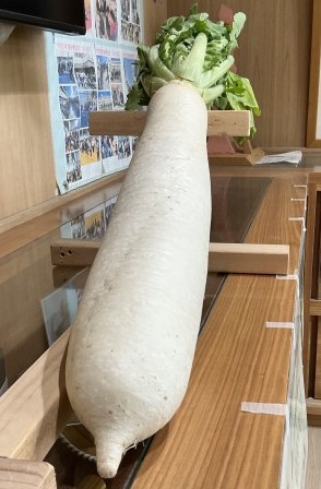 今日の給食は、おでん。そのおでんに入っていた大根は「大蔵大根」です。世田谷区にゆかりの大根で、立派な大根が1階昇降口に展示されています。