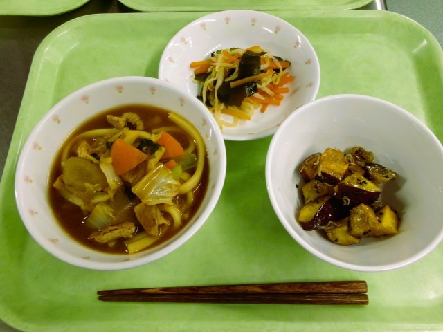 みそ煮込みうどん 牛乳 野菜のからしじょうゆ じゃこ入り大学いも
