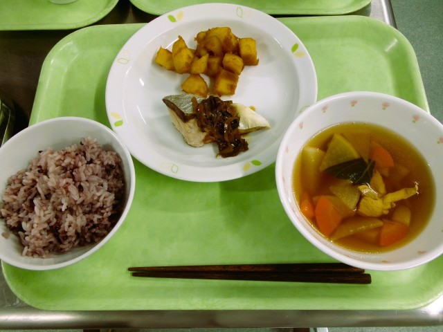 黒米ごはん 牛乳 魚の南蛮焼き じゃがいもの甘辛煮 東京野菜スープ