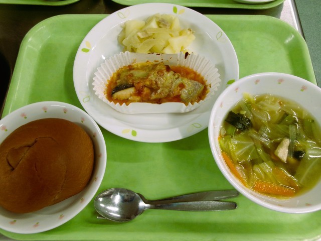 ココアパン 牛乳 魚のピザ風 ジャーマンポテト キャベツのスープ