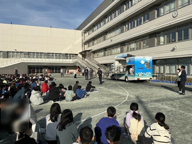 避難完了後、5年生の代表が起震車に乗って震度7を体験しました。
