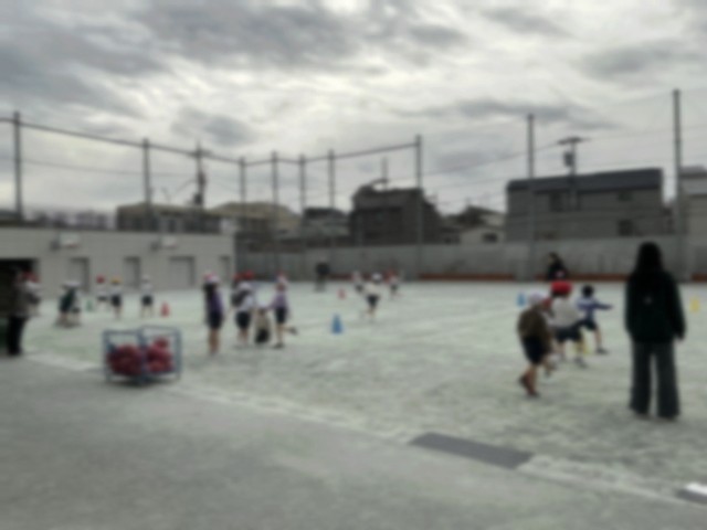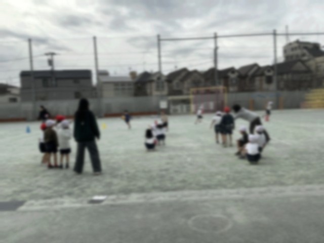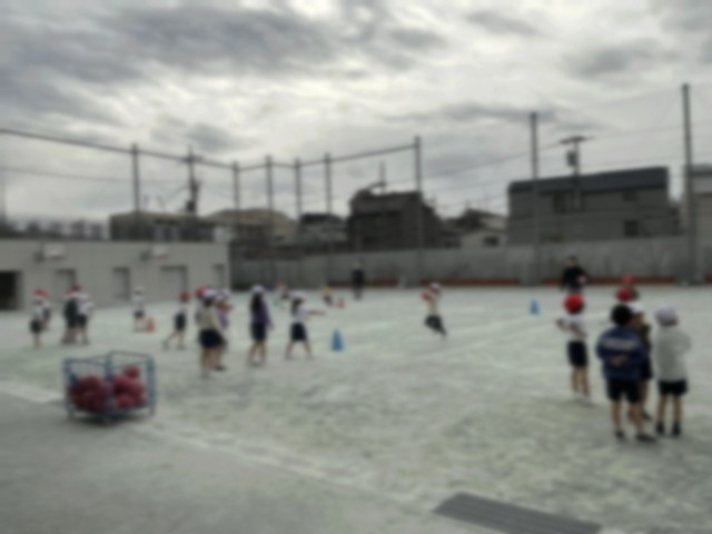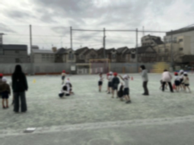 校庭では寒さに負けず1年生が元気よく体育で身体を動かしています。特に今日は寒いですが、とても元気な1年生。