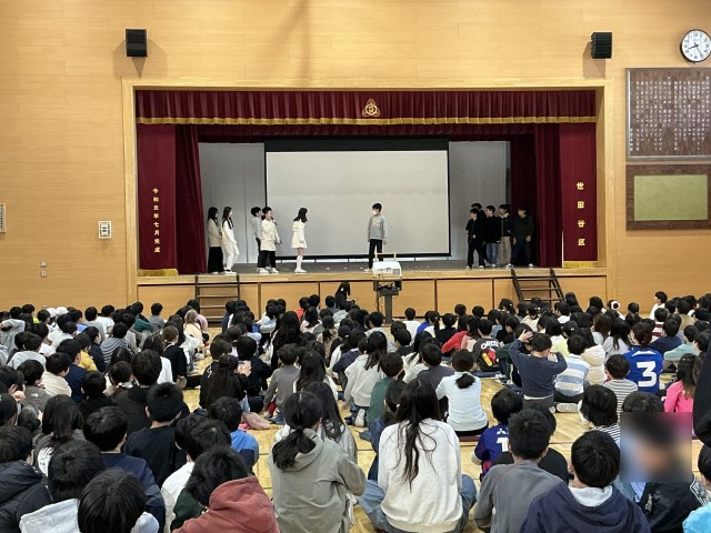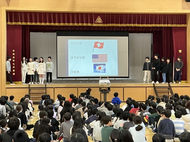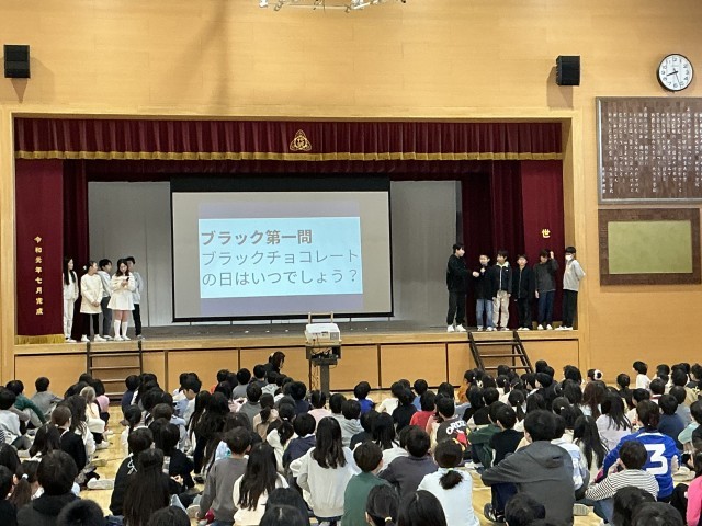 2/4(水) 児童集会では、バレンタインデーにちなんでブラックチョコレートやホワイトチョコレートについて、クイズを交えながらの児童集会が行われました。