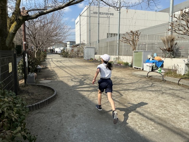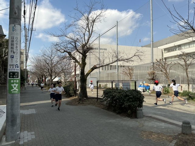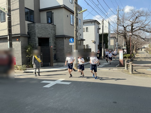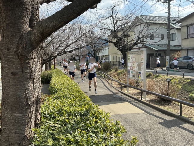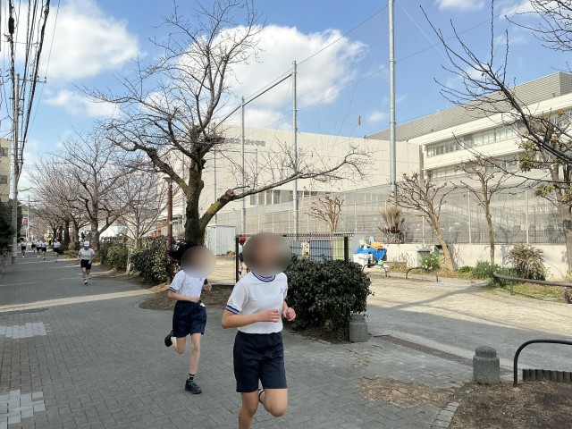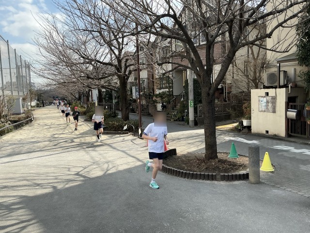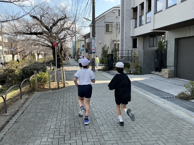 5、6年生は、校庭を3周回り、緑道は右折して茶沢通り手前まで走り、折り返します。