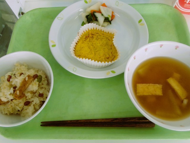 まめまめおこわ 牛乳 たまご焼き かぶとにんじんの甘酢かけ 田舎汁