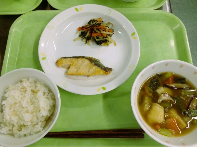 麦ごはん 牛乳 魚の西京焼き 野菜の磯あえ すいとん